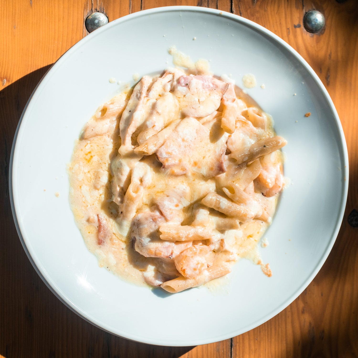 Camarón (100 g), pollo (100 g) y jamón en crema de quesos gratinados.
