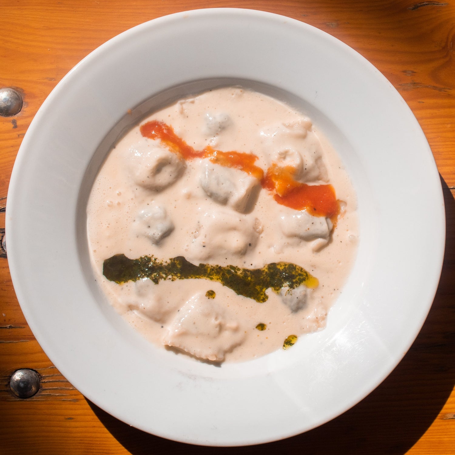 Rellenos de espinaca y queso, bañados con crema y un toque de tomate y pesto.
